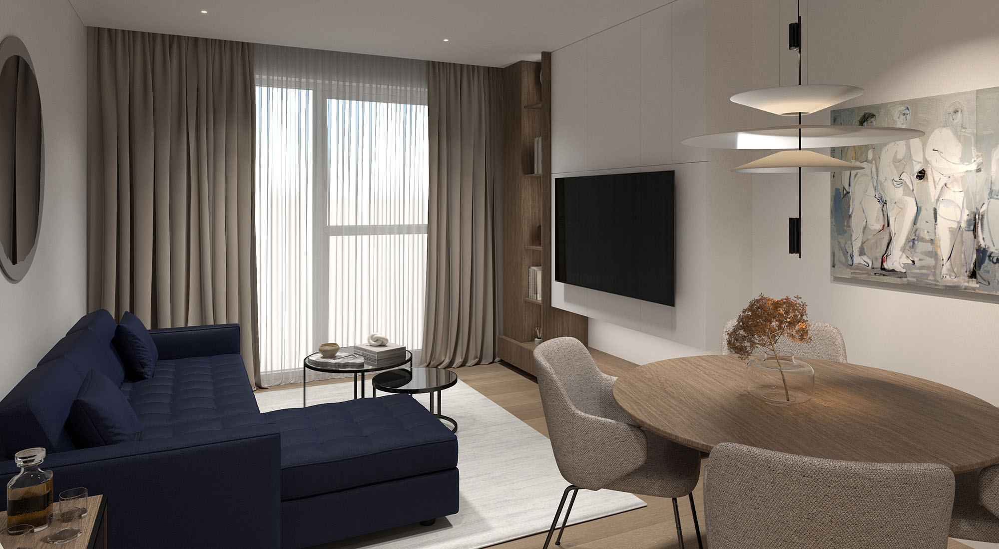 A full renovation of an existing two-bedroom flat, designed with a focus on refined functionality. The upgrade features bespoke joinery, a newly fitted kitchen, updated flooring, and a layered lighting design that enhances spatial flow and atmosphere. Smart planning allows the second bedroom to operate as a fully integrated home office, with discreet solutions that enable an effortless transition into a comfortable guest room when needed.