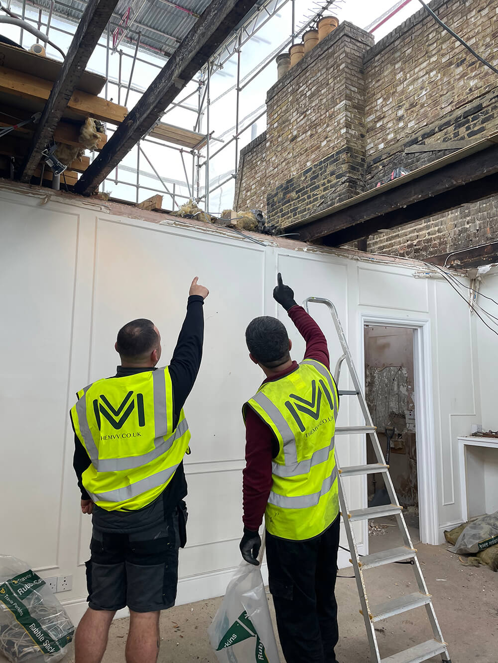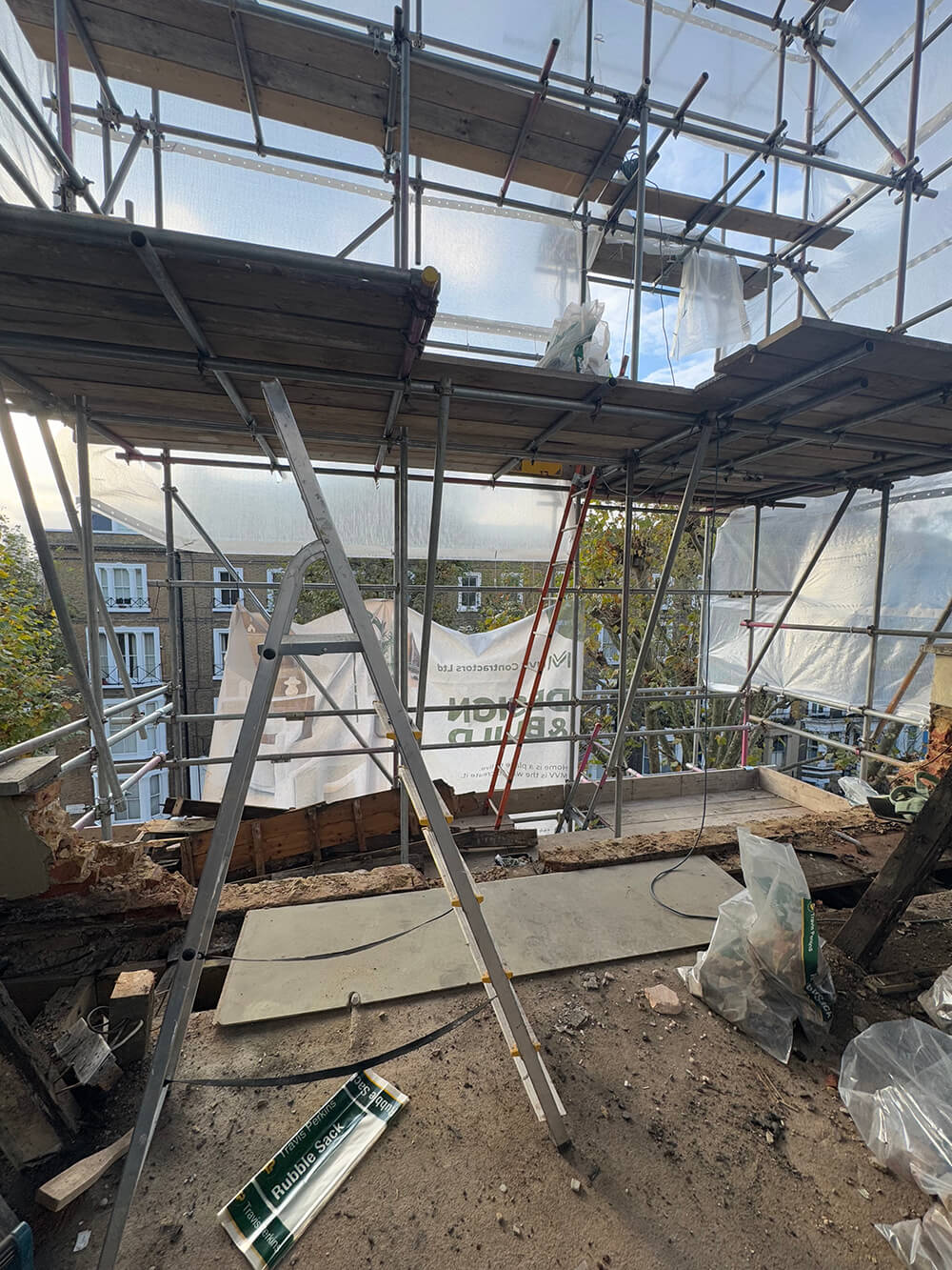 Erecting scaffolding, removing existing structures and rooms, and taking down the chimney breast to prepare for the new build.