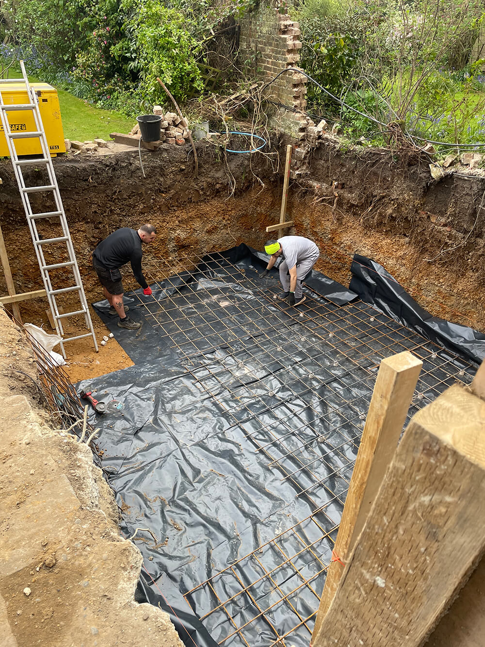 Excavating the ground to the required level, followed by temporary support of the existing structure while installing the new framework for the extension.